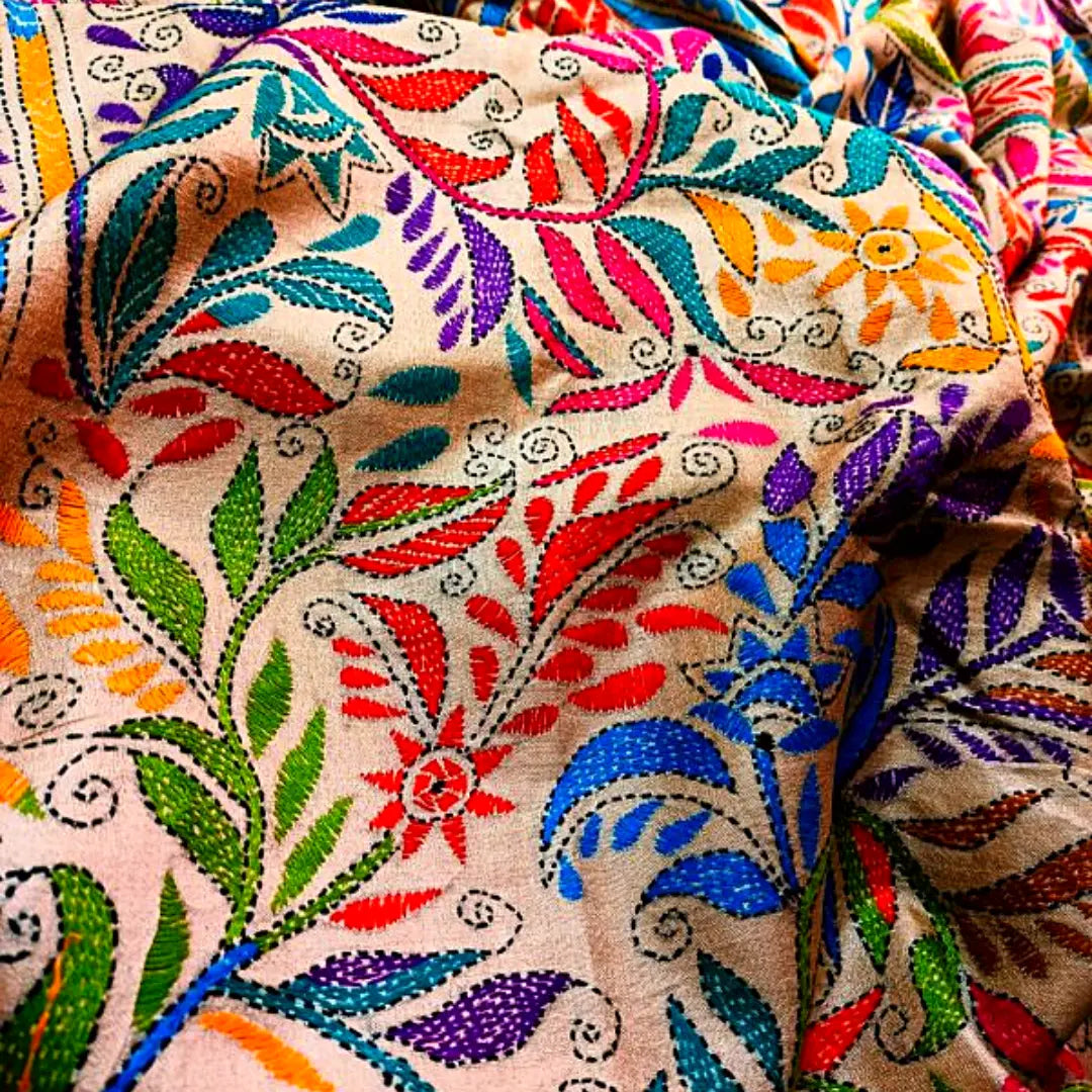 If the fabric looks shiny and feels slippery, it’s most likely not genuine Kantha work from Bengal.